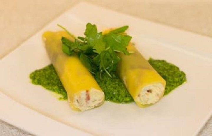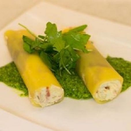 Llenar una manga pastelera con la mezcla y rellenar los canelones obstruyendo el otro lado con la mano para que el relleno no se escape. En un plato con una cuchara formar una cama de pesto y colocar los canelones en la parte superior.