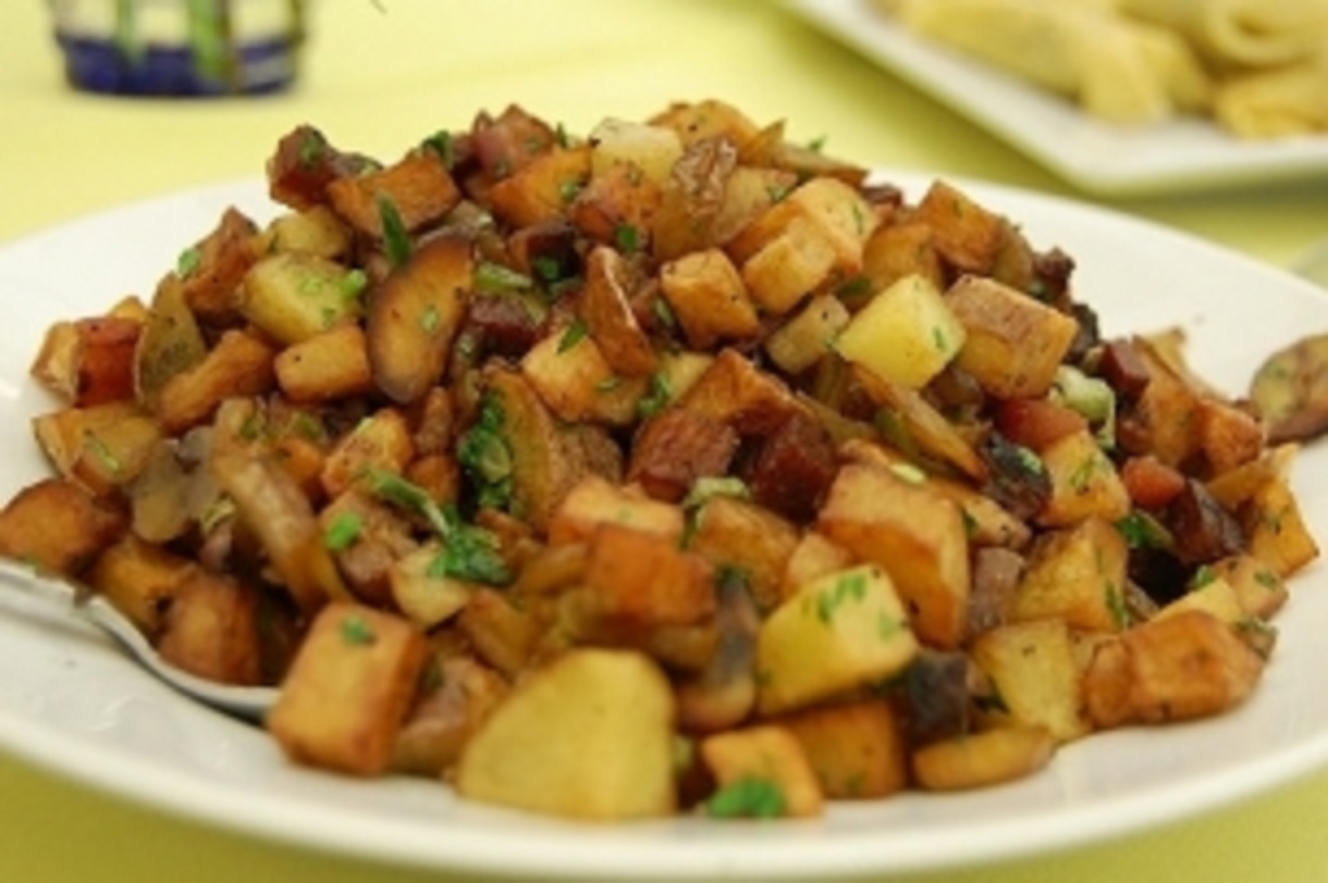Limpiar muy bien los champiñones y cortar en láminas finas. Añadir a la sartén con los patatas. Pelar y picar muy finamente el ajo y el perejil. Añadir a la sartén y freír durante diez minutos más.