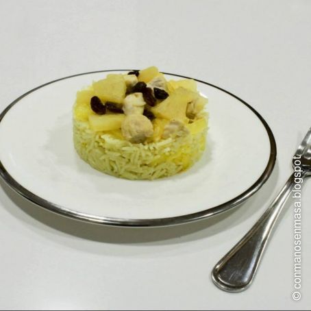 Cuando la cebolla esté tierna, añadir el pollo cortado en trozos, las rodajas de piña también troceadas y las pasas. Remover bien y cocer a fuego lento hasta que el pollo esté hecho