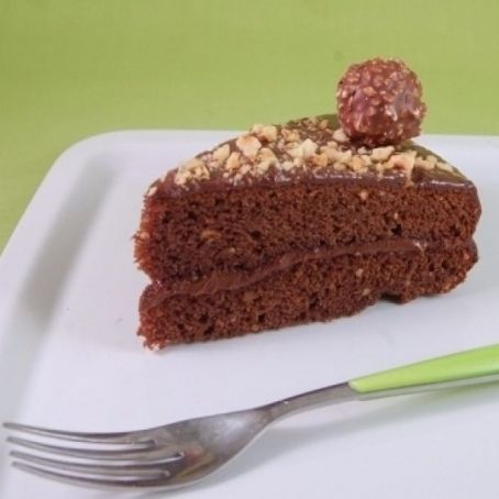 Fantástica tarta de chocolate y avellanas con un sorprendente sabor a Ferrero Rocher. La receta está compuesta de una base de mousse de chocolate, un relleno de Nutella y una cobertura de chocolate con almendras picadas.