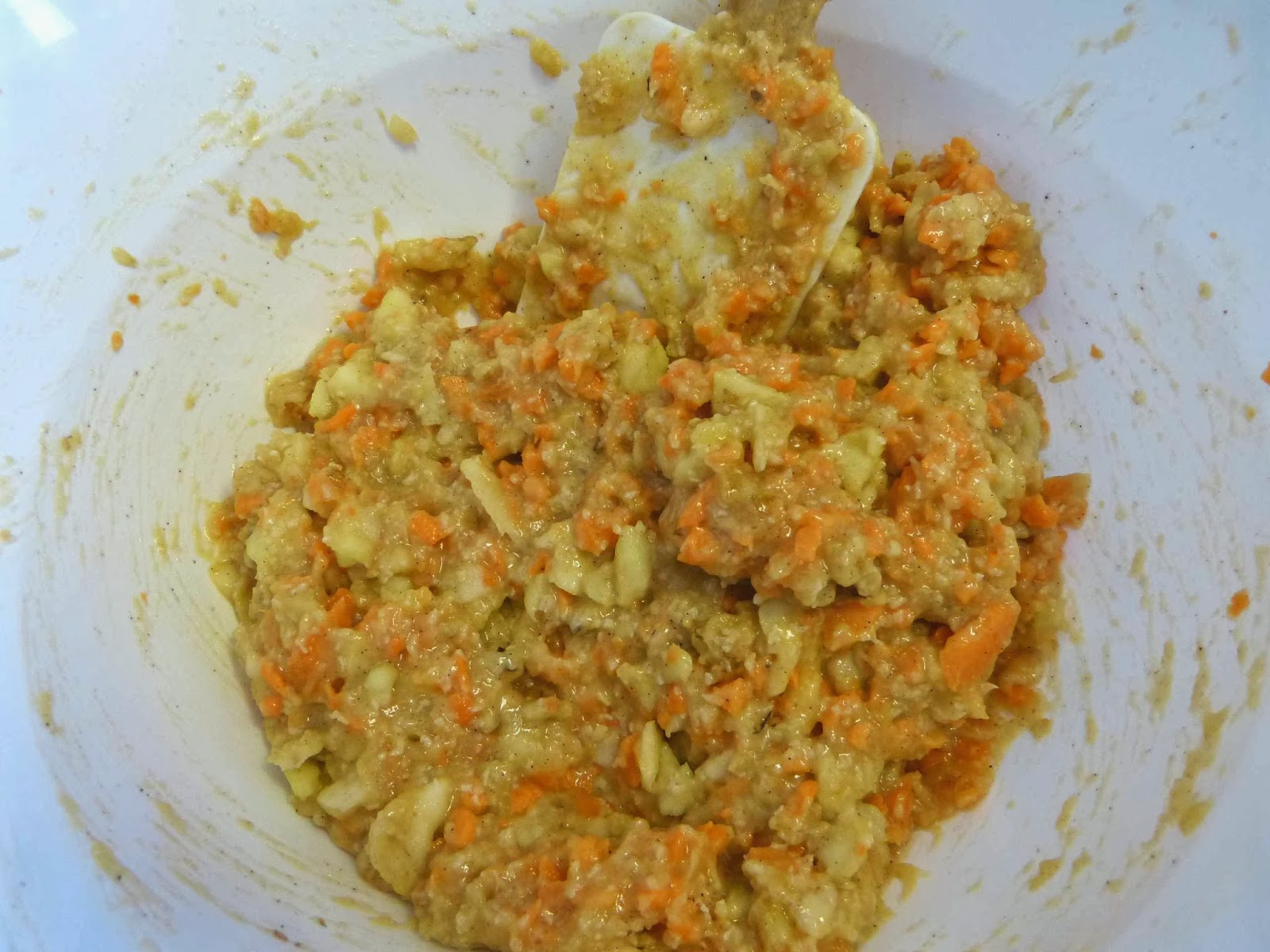 Nos quedará una masa aparentemente seca pero, en cuanto la introduzcamos en el horno, con la temperatura, la manzana y la zanahoria se ablandarán y la consistencia del muffin será muy jugosa.