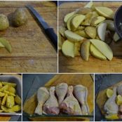 Introducimos el pollo en el horno y arriba sobre una rejilla, la bandeja de patatas. Así hacemos las dos cosas a la vez.