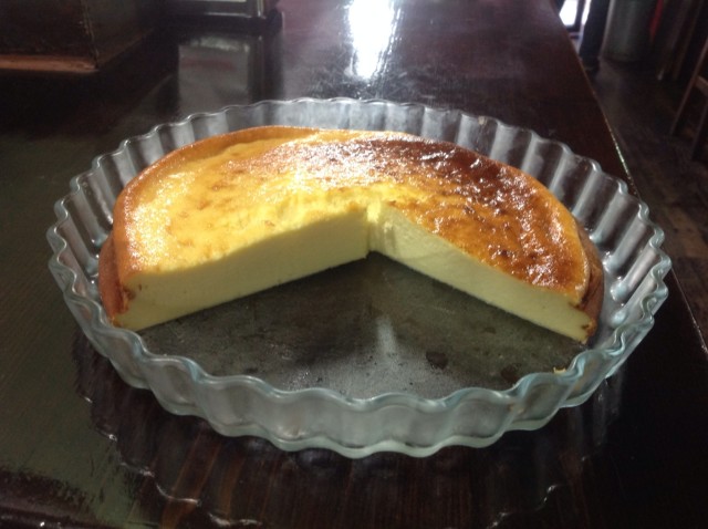 Precalentar el horno a 180 grados, enmantecar un molde 24 cm y poner la mezcla en horno por 30 minutos y cuando este dorada, apagar el horno y dejarla reposar 5 minutos más, la tarta bajara, pero la textura es bien cremosa.