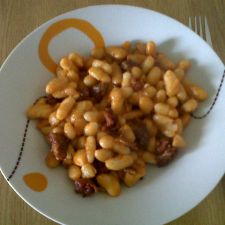 Se frien los ajos picados en aceite de oliva. Se añade pimenton y se hechan las habas.