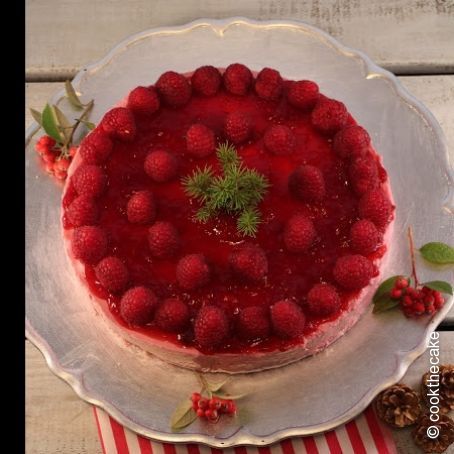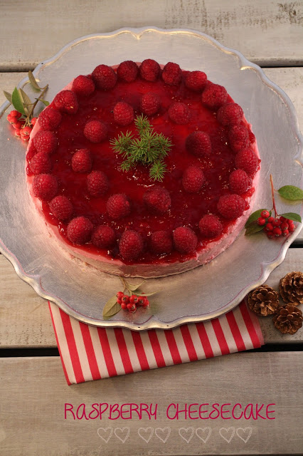 Al día siguiente, desmoldamos el cheesecake y lo adornamos. Yo le he puesto una capa de mermelada de frambuesa y unas frambuesas frescas.