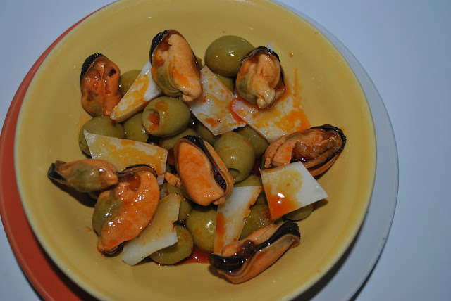 Se prepara un platito se colocan las aceitunas escurridas se corta encima taquitos de queso y se echa encima los mejillones en escabeche con su liquido