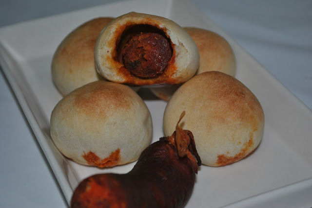 Cortar los chorizos y ir rellenados y poniendolos sobre la bandeja de horno.