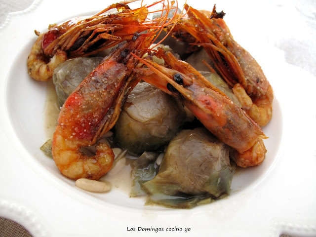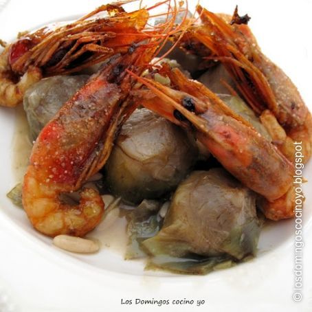 Un plato que sirve como entrante o aperitivo. El sabor un poco amargo de las alcachofas contrasta muy bien con las gustosas gambas.