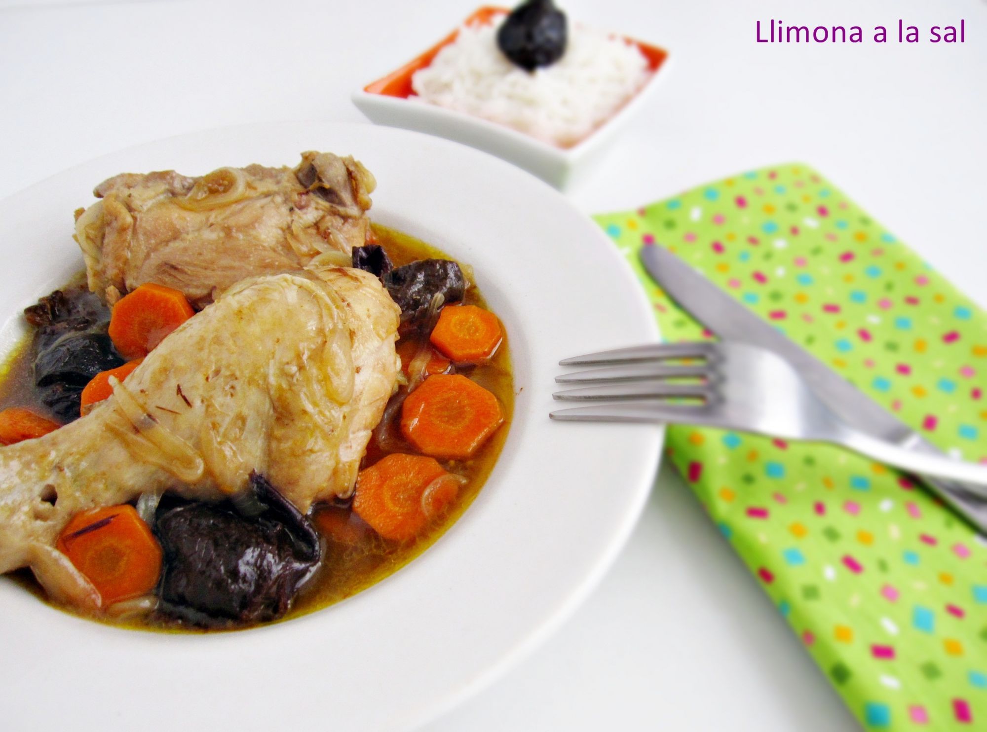 En una cazuela ponemos un chorrito de aceite y doramos los muslos de pollo sazonados (yo los he cortado en tres trozos cada muslo). Una vez dorados retiramos los muslos y en ese mismo aceite rehogamos las zanahorias cortadas en rodajas, a continuación le añadimos la cebolla troceada en juliana y las ciruelas. Cuando estén los ingredientes pochados regamos con un chorrito de vino blanco y dejamos evaporar el alcohol.