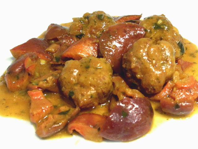 Volcamos la salsa sobre las albóndigas que teníamos reservadas, las terminamos de cubrir con agua y las dejamos cocer 15 minutos.
