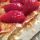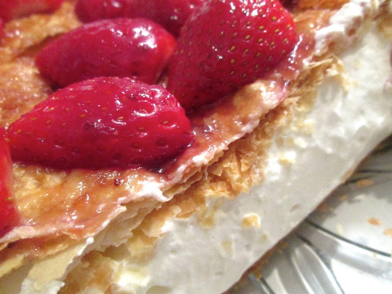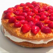 Colocamos una de las placas en la bandeja que vayamos a utilizar para llevar a la mesa. Rellenamos con la mezcla de nata y queso que teníamos reservada. Tapamos con la otra placa de hojaldre y barnizamos con parte del almíbar toda la superficie (para que las fresas queden pegadas). Decoramos con las fresas y las pintamos con el resto del almíbar.