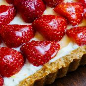 Extender el relleno sobre la masa horneada con ayuda de una espátula y alisar la superficie. Colocar las fresas cortadas encima y con un pincel, barnizamos las fresas con la miel previamente calentada en el microondas durante aproximadamente 10 segundos.
