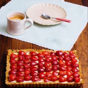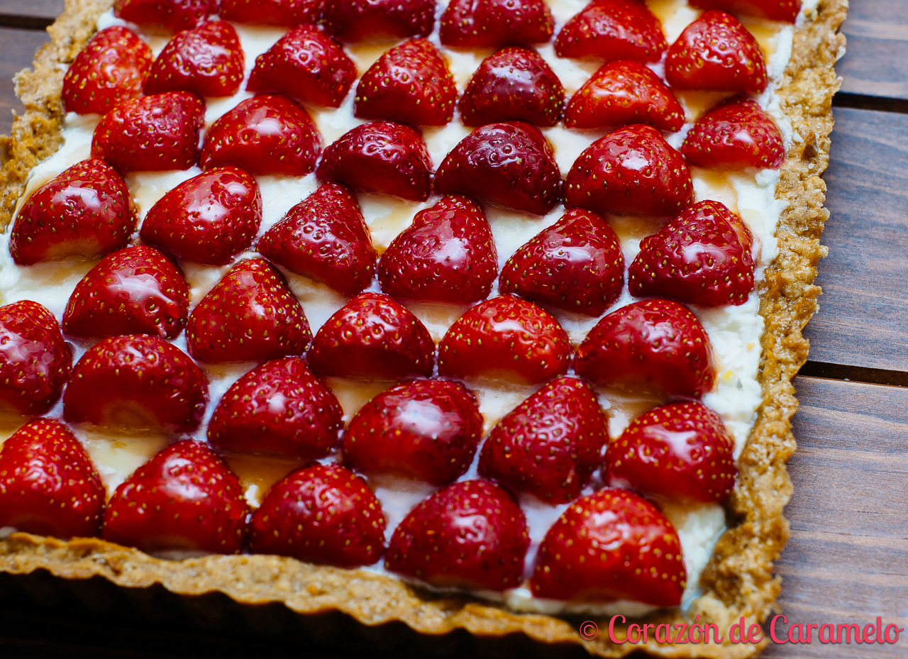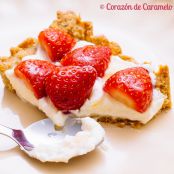 Es una tarta muy sencilla de hacer y que además se elabora en muy poco tiempo, básicamente el tiempo que tarda en hacerse la masa quebrada porque mientras ésta se hornea puedes ir batiendo el queso y cortando las fresas.