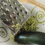Comenzamos pochando la cebolla picada, simplemente para que vaya cogiendo un poquito de color. Mientras rallaremos el calabacín, mejor si tenéis un rallador grueso. Lo añadimos a la cebolla y dejamos que se haga todo junto con una pizca de sal .
