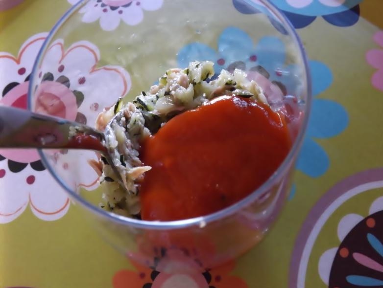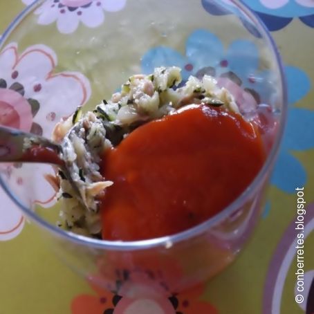 Preparamos el atún, desmigándolo y lo añadimos a la mezcla anterior. Ya solo queda enfriar un poquito más y a la hora de servir, como he hecho yo esta vez, lo podéis acompañar de una cucharadita de salsa de tomate.
