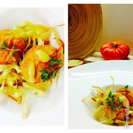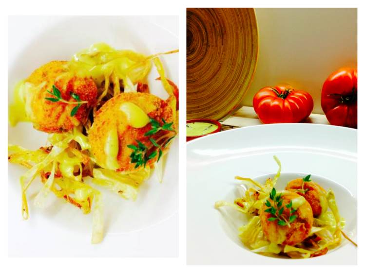 Albóndigas de pollo sobre crujiente de puerro y salsa alioli