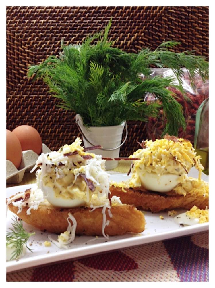 Tosta de huevo cocido en su crema con cecina y eneldo