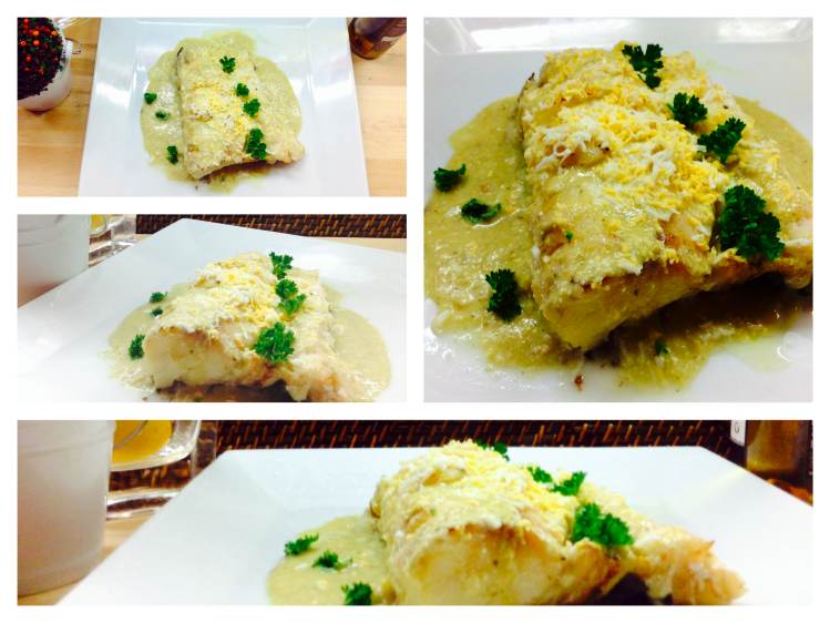 Echamos la salsa sobre el pescado, rallamos huevo por encima y le colocamos unos repollitos de perejil rizado para presentarlo a la mesa.