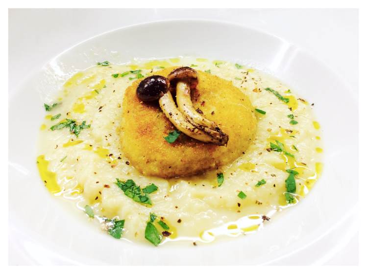 Servimos la crema en el plato y colocamos los buñuelos e el centro. Espolvoreamos perejil picadito y echamos un toque de aceite de oliva virgen extra. Hemos colocado unas setas fritas que le dan al plato un toque muy coquetuelo.