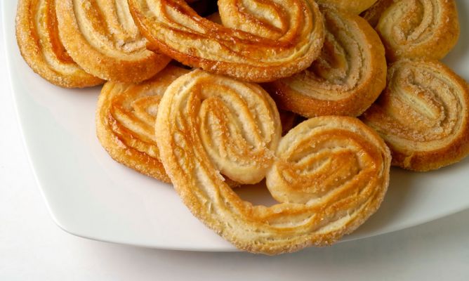 Coloca las palmeritas en una bandeja con un papel de hornear. No las pongas demasiado cerca unas de otras porque crecerán durante el horneado. Mete en el horno precalentado a 200°C y déjalas 10 minutos. Luego, con cuidado de no quemarse, dales la vuelta y deja que se doren entre 2 y 5 minutos más.