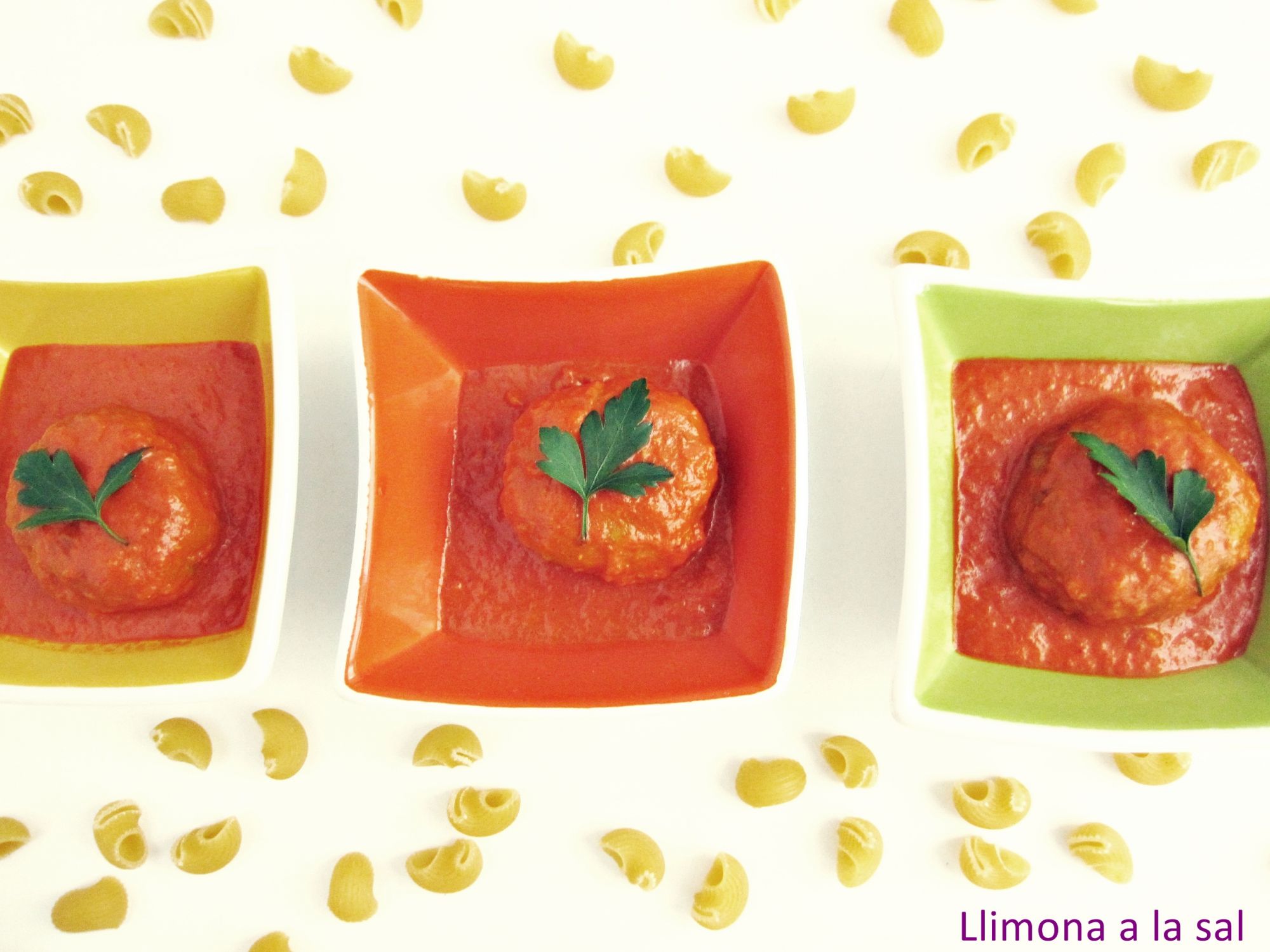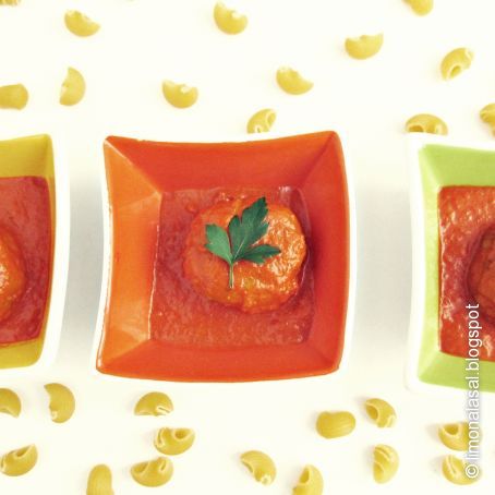 Vertemos la salsa de pimientos otra vez a la sartén, y le añadimos un chorrito de agua para que no quede tan espesa y la ponemos bien de sal si hiciese falta. Le incorporamos las albóndigas y dejamos cocer unos 5 minutos aproximadamente.