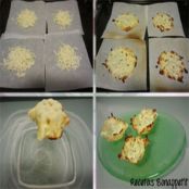 Mientras hacemos las cestitas. Recortamos papel de horno en cuadrados y colocamos encima un puñado de queso mozarella. Lo metemos al horno hasta que el queso se funda y se dore.