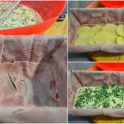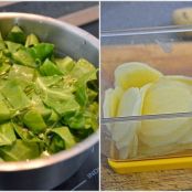 Ponemos una capa de patatas, un cacito de la mezcla de acelgas, huevos, nata y queso rallado. Encima otra capa de patatas, así hasta cubrir el molde.