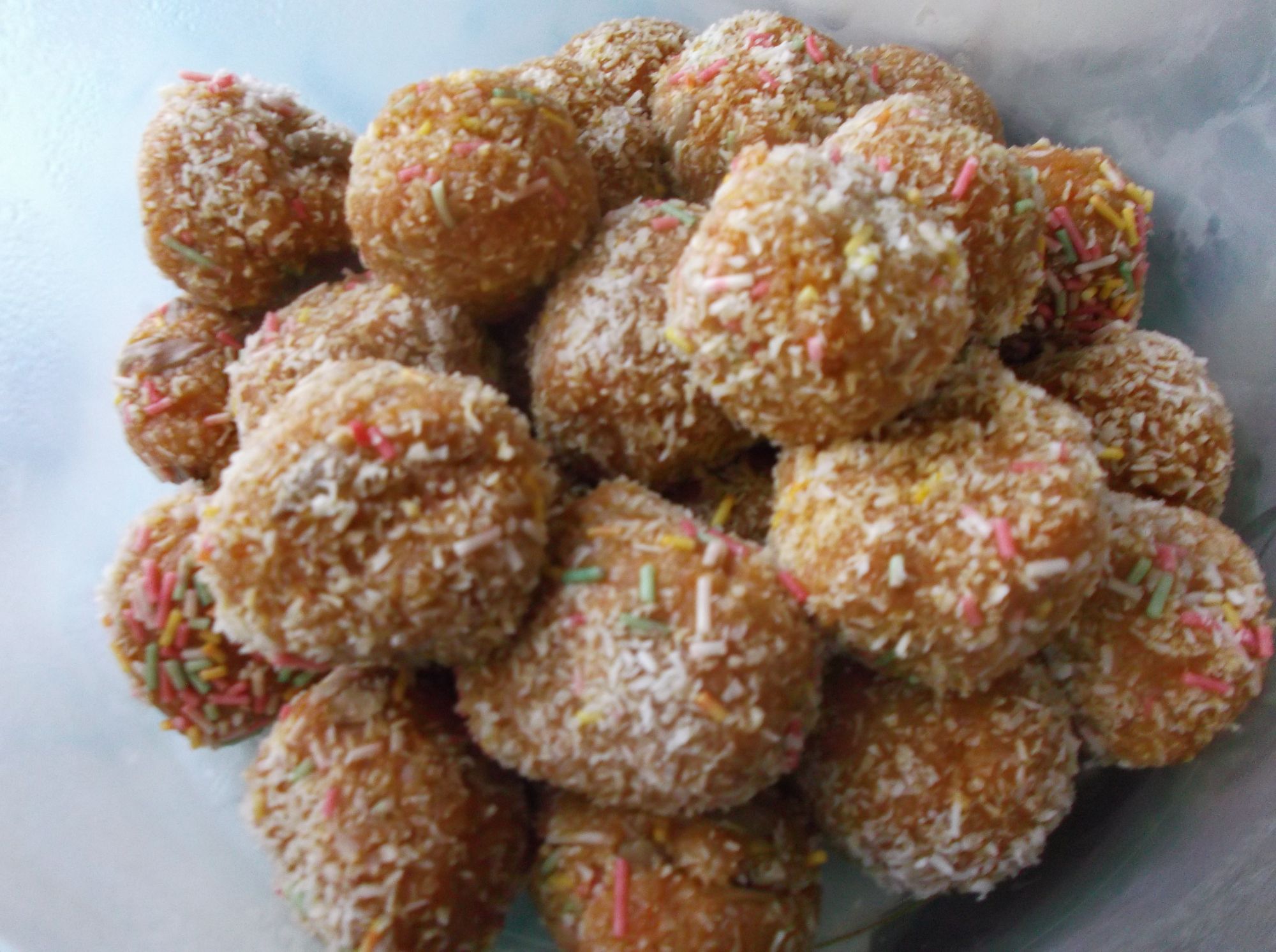 Rebozamos las bolitas en la mezcla de fideos de chocolate y coco.