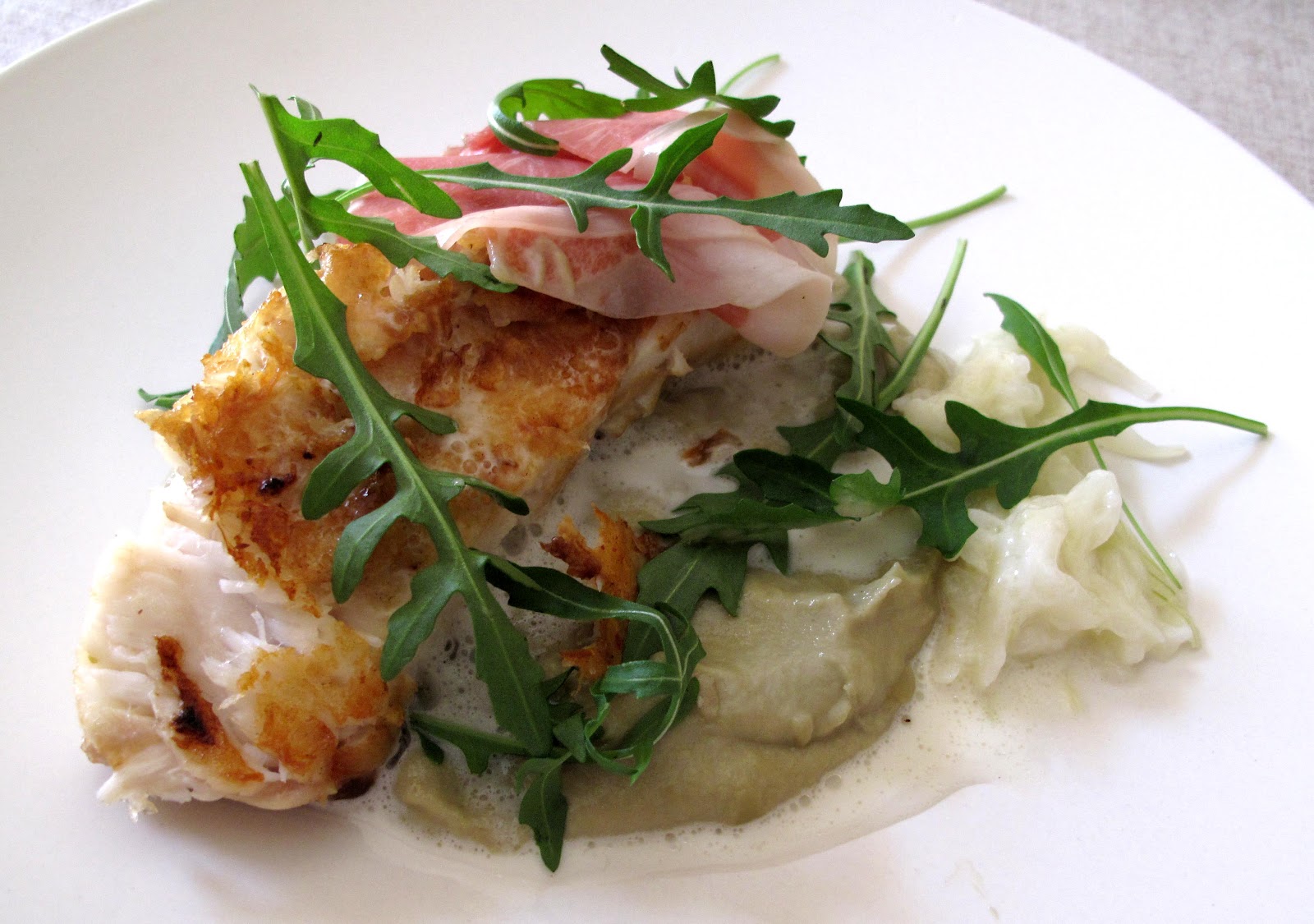 En cada plato se pone una cucharada de puré de alcachofa y encima se pone un trozo de mero, unas hojas de rúcula y unas lonchas de jamón. Incorporar como guarnición un poco de cebolleta y la emulsión.