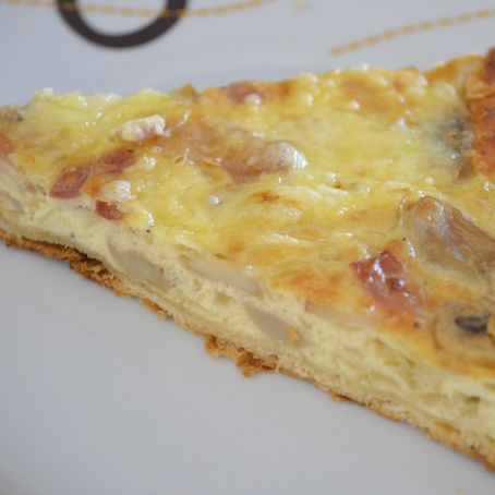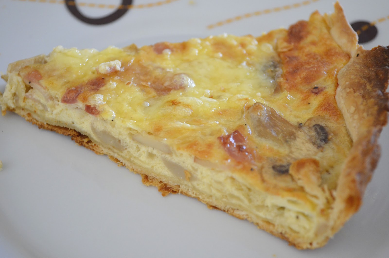 Por otro lado, colocamos la masa quebrada en un molde engrasado con mantequilla y rociado con un poquito de harina (otra opción es cubrirlo con papel vegetal). Añadimos la mezcla de la batidora y los champiñones que habíamos reservado. Repartimos bien para que quede colocada de forma homogénea.