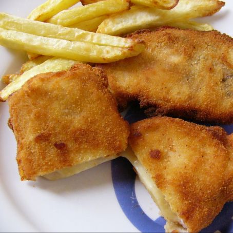 - 8 filetes de lomo de cerdo abiertos a la mitad, 8 lonchas de queso para fundir, 1 lata de pimientos piquillo en tiras, 2 patatas, 2 huevos, pan rallado, sal.
