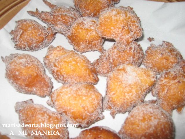 - Colocarlos en una fuente con papel de cocina para que absorba el exceso de aceite y cuando terminemos los ponemos en la fuente donde vayamos a servirlos espolvoreándolos de azúcar en grano (Yo más que espolvorearlos...los rebocé)