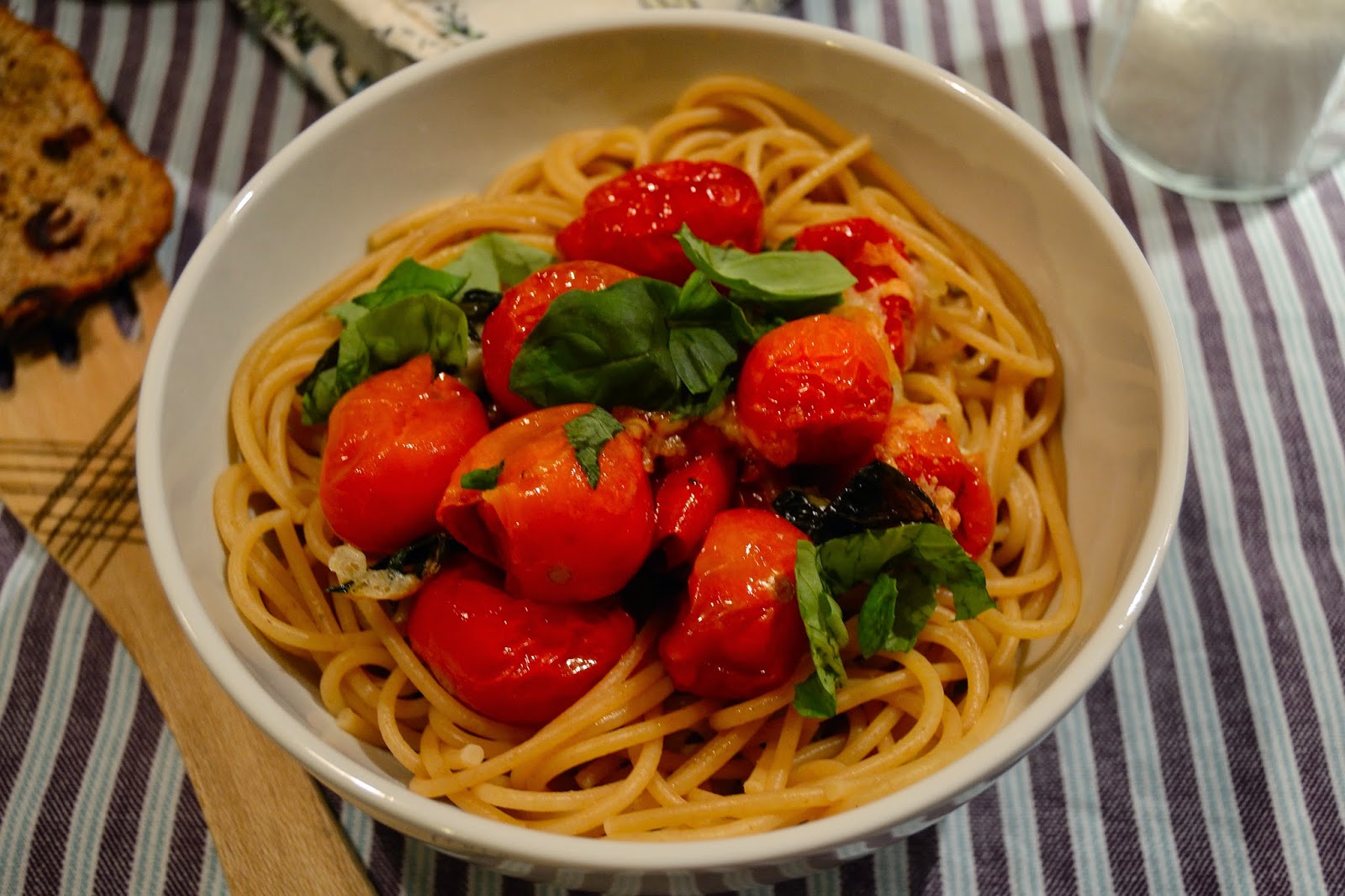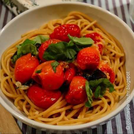 Para esos días en los que no apetece cocinar o quizás no se tiene el todo el tiempo deseado para ello, os propongo una receta muy sencilla de preparar: espagueti con tomates asados, albahaca y ajitos. Y además mientras los tomates se van asando podemos ir haciendo otras cosas.
