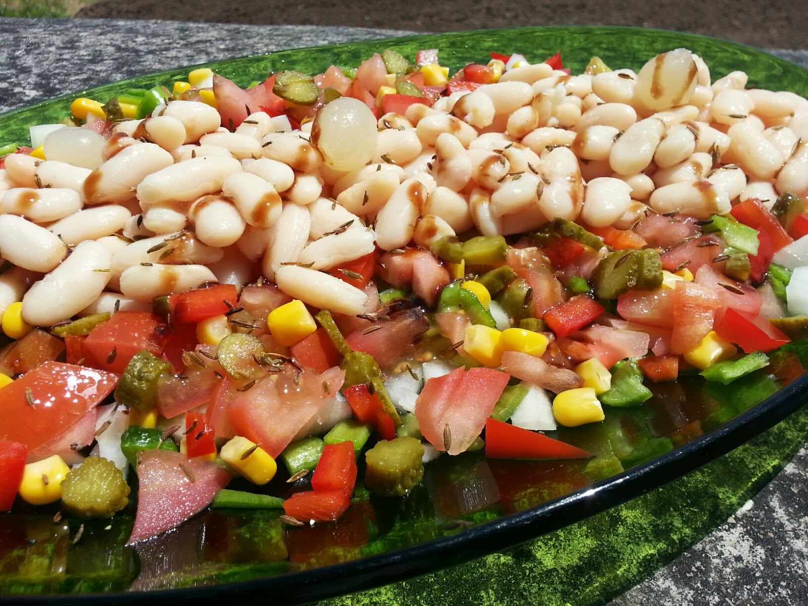 Picamos todas las verduritas en daditos, vamos montando en una fuente o ensaladera, sacamos las alubias del bote, las enjuagamos bien bajo el grifo, escurrimos y añadimos a la ensalada, sazonamos, especiamos, añadimos aceite y vinagre...y a disfrutar :)