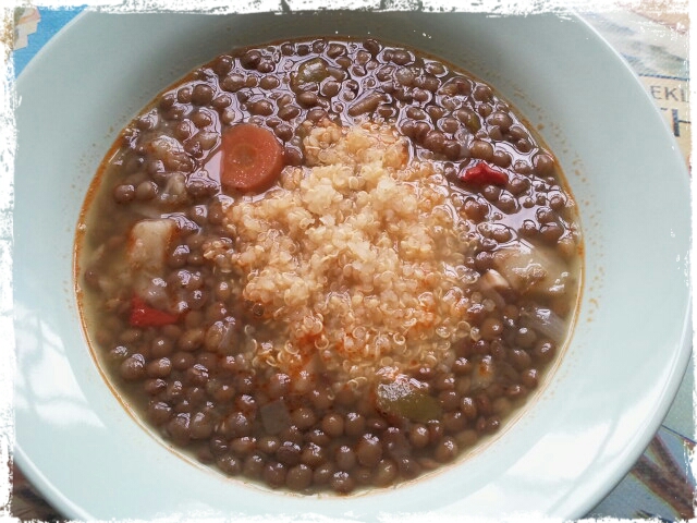 Para la quinoa, una parte de quinoa por dos de agua y 15 minutos hirviendo, escurrir y añadir en cada platito un puñadito para acompañar a las lentejas.