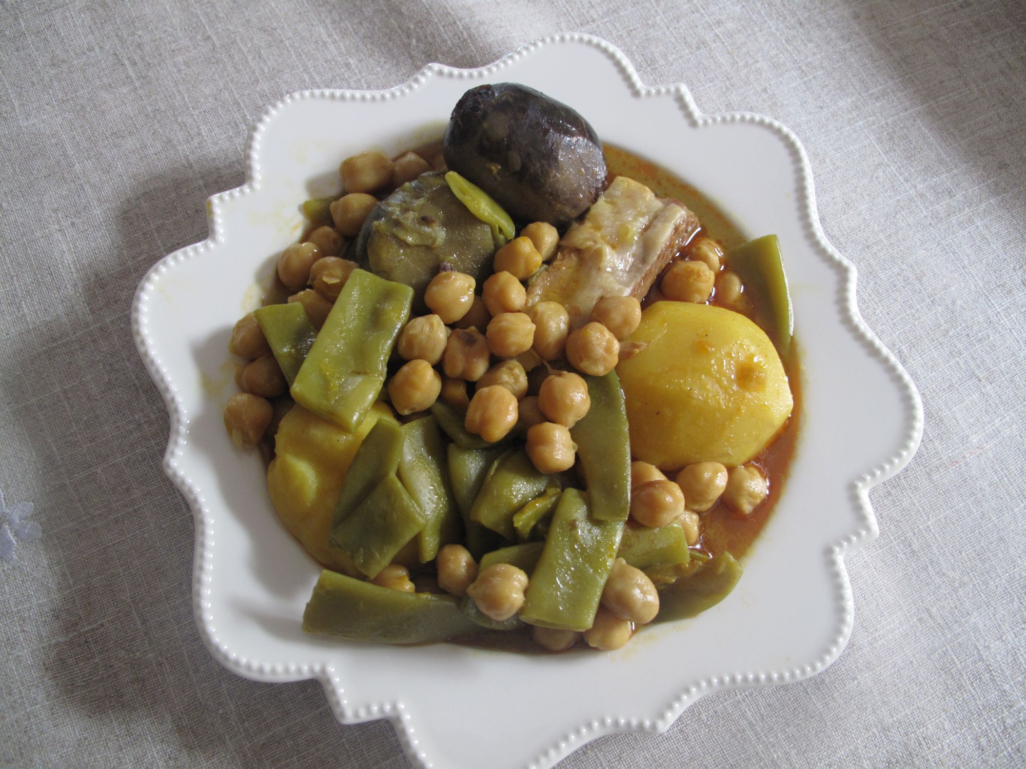 - ½ Kg. de garbanzos, 2 costillejas partidos en trozos (4 o 6), 4 morcillas de cebolla un poco secas para que no se rompan al guisar, 250 gr. de judías (bachoquetas), 1 cebolla, 2 tomates, 1 chirivía, 4 alcachofas, 3 o cuatro patatas, 1 cucharada de pimentón dulce, 2 o 3 cucharadas de harina, aceite y sal.