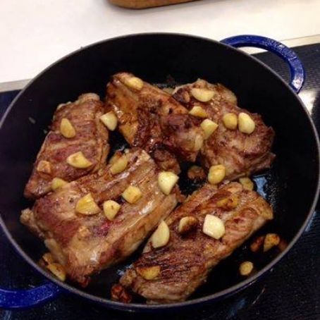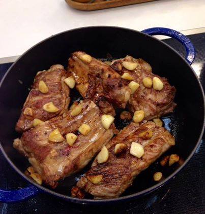 Vierta el aceite en una olla y los ajos. Dejarlos durante 1 minuto friendo y agregar las costillas. Mezclar, hasta que cambie de color.