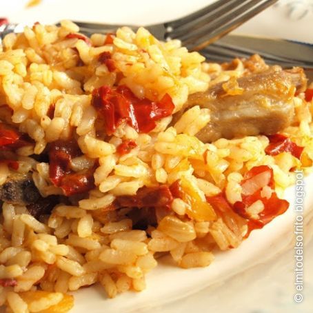 En una cazuela freís la costilla, lentamente. Cuando esté doradita, la sacáis y reserváis. En esa misma cazuela, y en el aceite que ha quedado, ponéis la cebolla picadita, que se haga. Incorporáis los pimientos choriceros en trozos y limpios de pepitas, le dáis unas vueltas y añadís el arroz. Removéis para que el arroz se impregne del sabor. Incorporáis las costillas. Vertéis el litro y pico de caldo hirviendo. Lo revolvéis un poco. Rectificáis de sal y que hierva 5 minutos a fuego fuerte y 10 minutos a fuego suave.