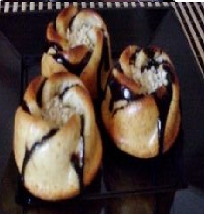 Los desmoldamos y una vez fríos se decoran con Sirope de chocolate y Almendras crocanti .