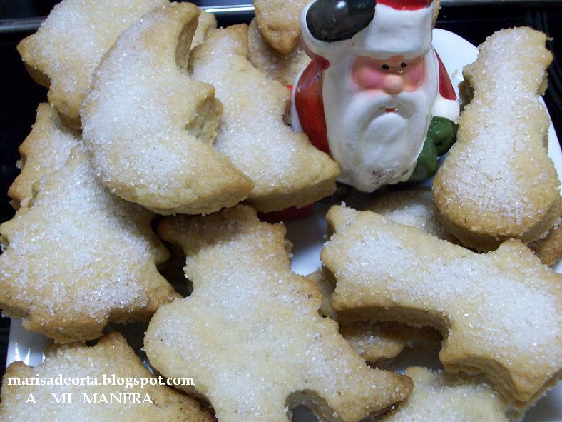 - Con corta pastas ir formando figuras de entre medio y un centímetro aproximadamente y ponerlas sobre una bandeja de horno forrada con papel parafinado y echar un poco de azúcar por encima.