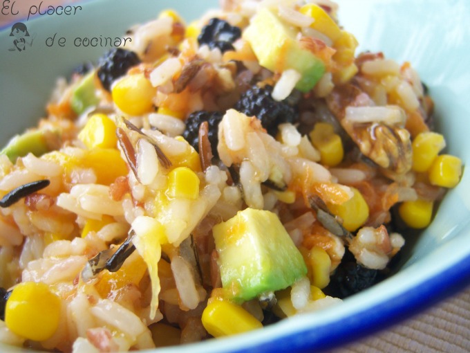 En el bol donde vayamos a servir la ensalada añadir las moras, el maíz, las nueces troceadas, el aguacate y el mango cortado en dados, la cebolla picada muy menudita, y por último el arroz. Aliñamos con sal, vinagre y aceite (si en ese orden), por lo visto ese es el orden correcto para que los dos primeros ingredientes penetren bien en el resto de la ensalada, ya que de otro modo si aliñamos primero con el aceite, se forma una capa en los alimentos que impide que el vinagre y la sal cumplan su misión. Eso sí, aquí aliñaremos al gusto de cada uno, que yo eso de seguir la "regla del aliño" (4 partes de aceite x 1 de vinagre) me la salto a la torera, que a mí me gusta que se note el vinagre.