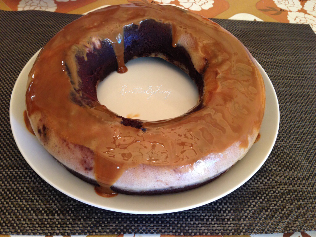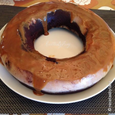 Echamos en el fondo del molde elegido dulce de leche y encima la masa del bizcocho. Encima de la masa del bizcocho, con cuidado y poco a poco, echamos la masa del flan. Tapamos con papel de aluminio. Ponemos el molde en una fuente con agua para hacerlo en el horno al baño maría. Se pondrá de agua hasta la mitad del molde en altura. Horneamos a 180 grados 1 hora o 1 hora y cuarto. Dejamos reposar una hora más y desmoldamos. Pasamos a la nevera para que enfríe y a servir y disfurtar!