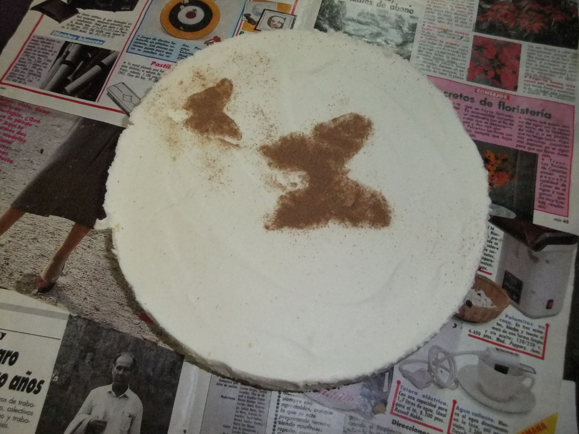 El último paso es montar la nata e incorporarla también poco a poco a la mezcla de la cacerola. Finalmente, vertéis la mousse sobre la base de galleta de vuestro molde y la metéis al frigorífico por lo menos durante doce horas y luego la podéis decorar como queráis con frutas, cacao, pero creo que lo mejor para esta tarta es ponerle en la superficie un poco de canela en polvo.