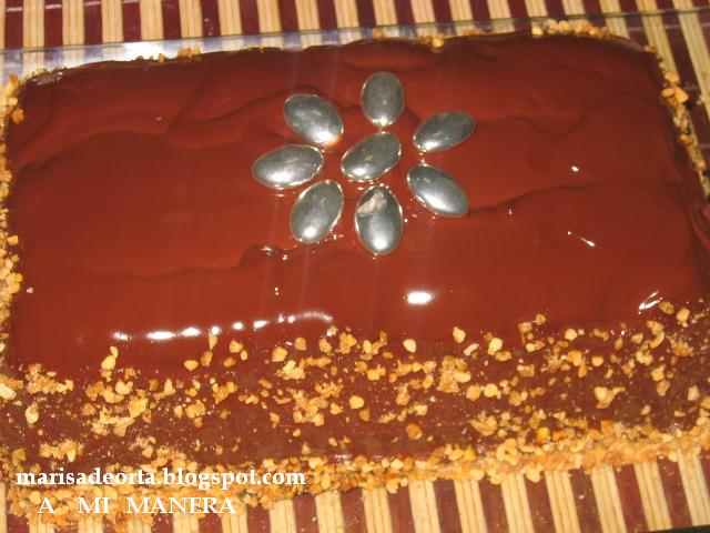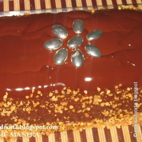 - Preparar la cobertura mezclando los ingredientes (los he puesto todos juntos en la thermo, sin tiempo a 37° vel.2 hasta que tuviera una textura suave y brillante), cubrir el pastel y decorar al gusto.