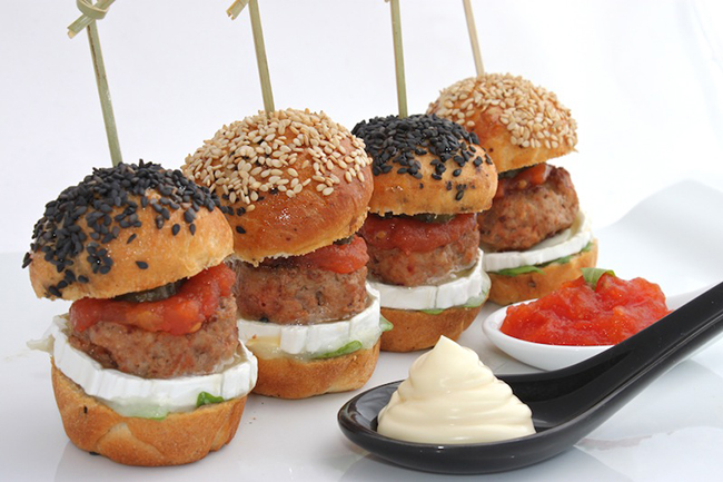 En una sartén freímos las hamburguesa por los dos lados hasta que estén a punto. Abrimos los panecillos por la mitad, ponemos en la base la rúcula, las hamburguesas a continuación, una rodaja de queso de cabra en dada una, la mermelada de tomate y la mahonesa, los pepinillos cortados en rodajas finas y ponemos las tapas, les damos un golpe de horno para que se derrita ligeramente el queso.