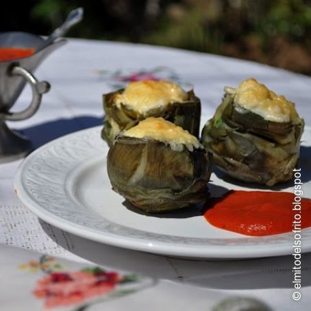 A las alcachofas les cortáis el rabito, sacáis las hojas exteriores y les cortáis la parte superior. Las echáis en el agua hirviendo. Las dejáis que cuezan 1/2 hora. Después, las sacáis y las ponéis sobre un plato, boca abajo para que escurran el máximo de agua posible.