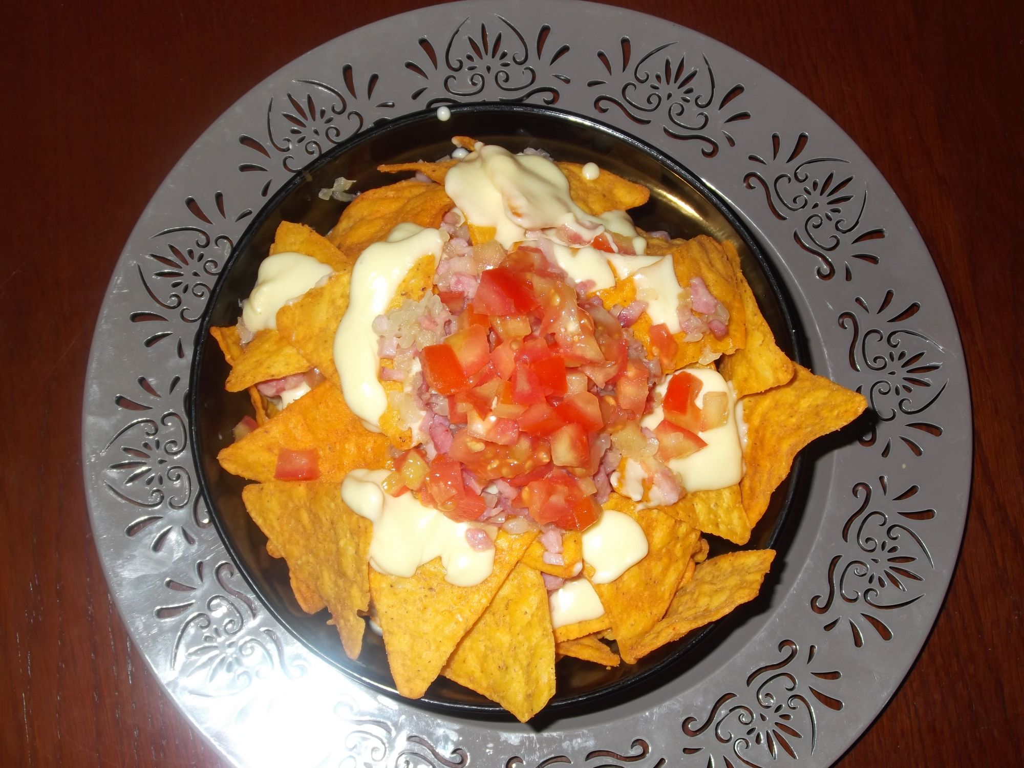 Por último, cortamos el tomate en dados. Ahora llega la hora de montar el plato, lo primero es echar unos 75 gramos de nachos en una fuente, ahora añades gran parte del sofrito, del queso chedar y un poco de tomate. Echamos otros 75 gramos de nachos, otro poco de sofrito y queso chedar y finalmente 50 gramos de nachos queso chedar y lo que nos haya restado del tomate y ya está listo para comer.