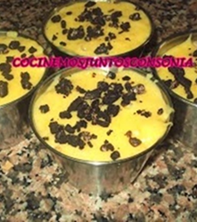 Desde hace ya unos días mi hija lleva diciéndome mama hazme flan de galletas pero las galletas no las pongas enteras me dijo que las había visto en un postre royal Natillas con oreo y como decirle que no, pobre mía se ha pillado el dedo con el capo del coche tendré que darle mimitos ainsss con que aquí están los flanes con trocitos de galletas.