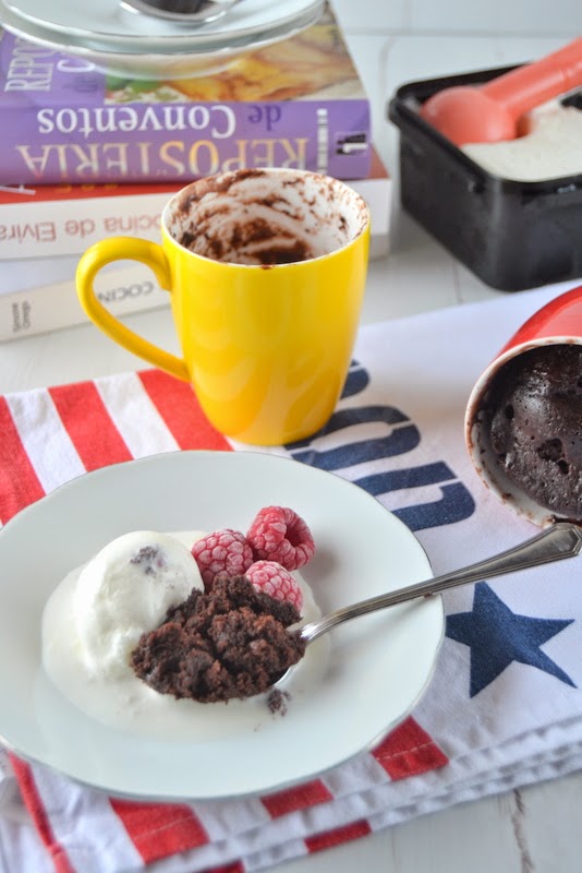 Nos lo comemos directamente de la taza, sólo o acompañado con una bola de helado y unas frambuesas que le van genial por el toque ácido.