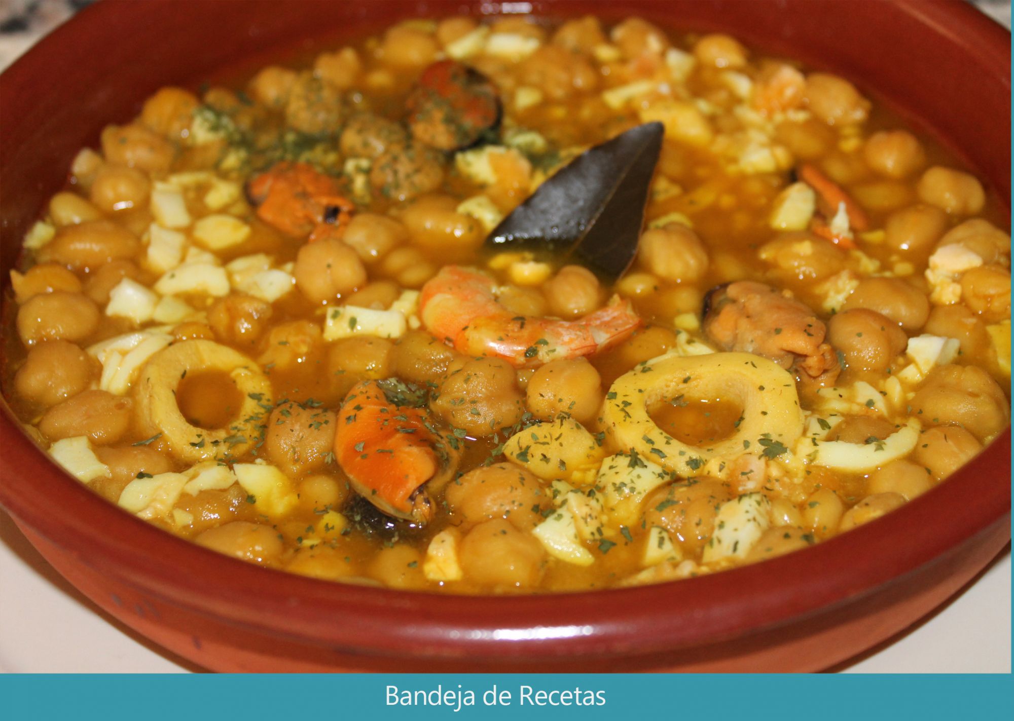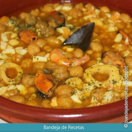 6. Calentar y rehogar los calamares y los langostinos en una sartén con un chorro de aceite. Una vez listos se incorporan a los garbanzos, junto a los mejillones sin la concha.